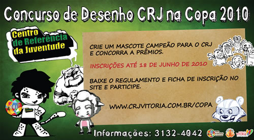 09/06/2010 - 1° Concurso de Desenho do CRJ O Centro de Referência da Juventude tem a satisfação de convidá-lo (a) para participar do 1° Concurso de Desenho do CRJ, com a proposta de criar um Mascote pro evento CRJ NA COPA. Os vencedores receberão uma boa premiação com materiais para desenho. Participe.